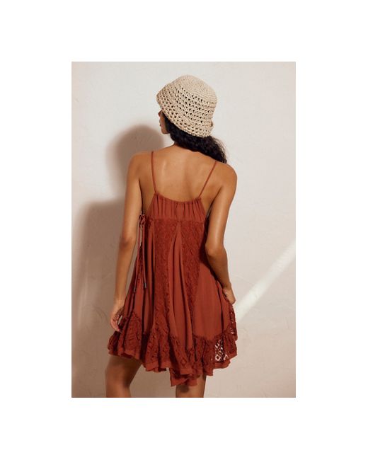 Lace panels and a ruched bust add a femme touch to this billowy babydoll dress from free-est. * Tie at bust * Scoop neckline * Adjustable ties at armholes * Signature airy gauze fabrication Beach Glow Mini Dress by free-est at Free People in Honey Topaz, Size: XS