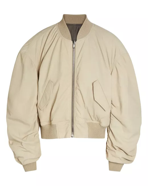 sand beige ribbed knit trim zip fastening flap pockets gathered sleeves