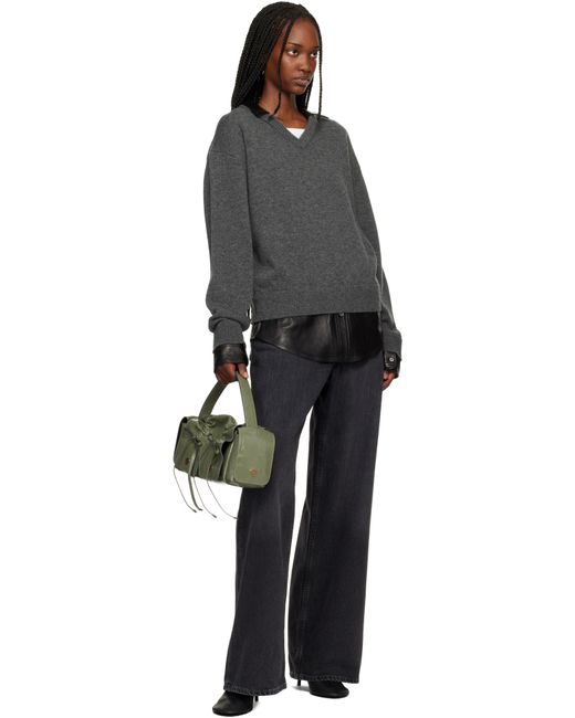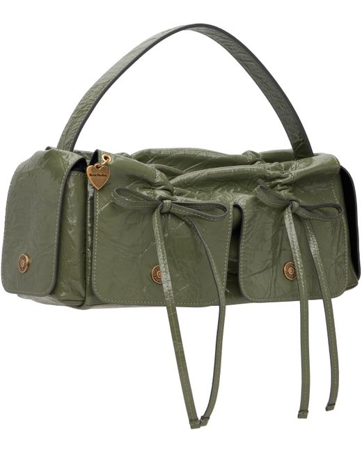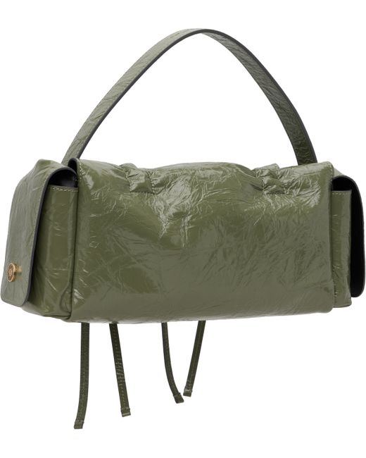 Crinkled patent goatskin top handle bag. · LWG-certified goatskin · Logo embossed at adjustable shoulder strap · Detachable crossbody strap · Logo charm and drawstrings at face · Flap pocket at sides · Magnetic flap · Patch pocket at interior · H6 x W14 x D4.5 Supplier color: Wheat green