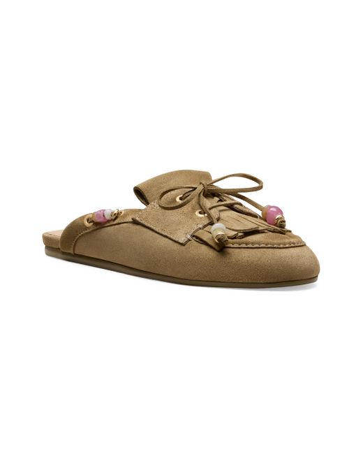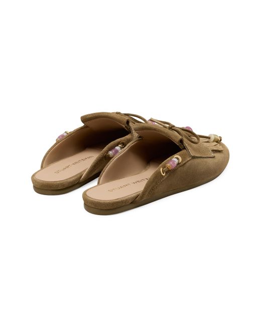 These Majorca Tinsley mules from Stuart Weitzman, crafted of suede, feature a round toe, a lace-up detail, and beaded trim. Round toe Slips on Suede upper Leather/polyester lining TPU sole Made in Spain ABOUT THE BRAND Designer Stuart Weitzman started his career designing for his father's shoe company, before launching his own brand in 1986. Known for his glamorous pumps and over-the-knee boots, Weitzman has also incorporated unique materials in his designs, ranging from Lucite and wallpaper to cork, vinyl and even gold. Today, the label continues to create classic, feminine silhouettes that balance both comfort and style. Women's Shoes - Stuart Weitzman W Shoes > Stuart Weitzman > Saks Fifth Avenue. Stuart Weitzman. Color: Golden Olive. Size: 7.5.