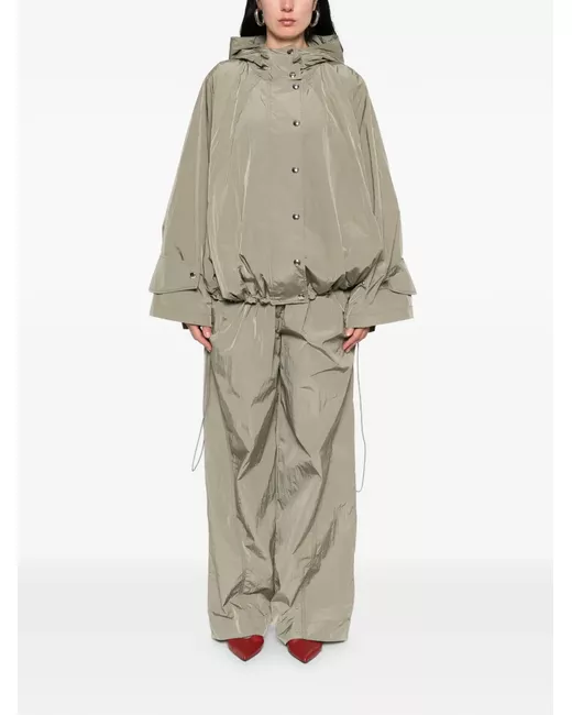 olive green high neck front button closure flap pockets bell sleeves gathered details