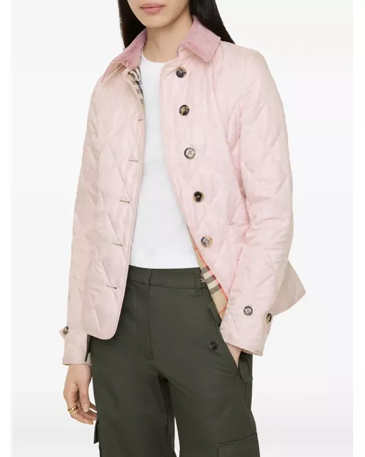 A quilted jacket lined in the Burberry Check in signature sand beige. The design is cut to a slim fit and topped with a tonal corduroy collar. Slim fit: this style is cut to a fitted silhouette. Fits true to size, take your normal size. light pink front button fastening
