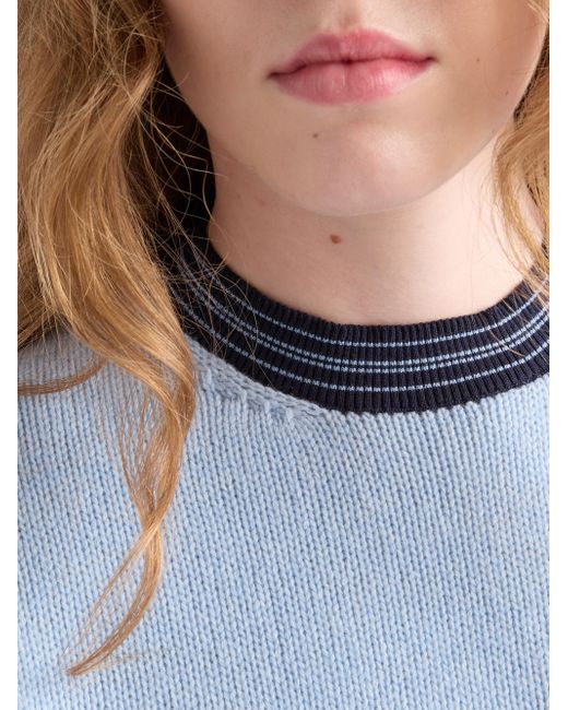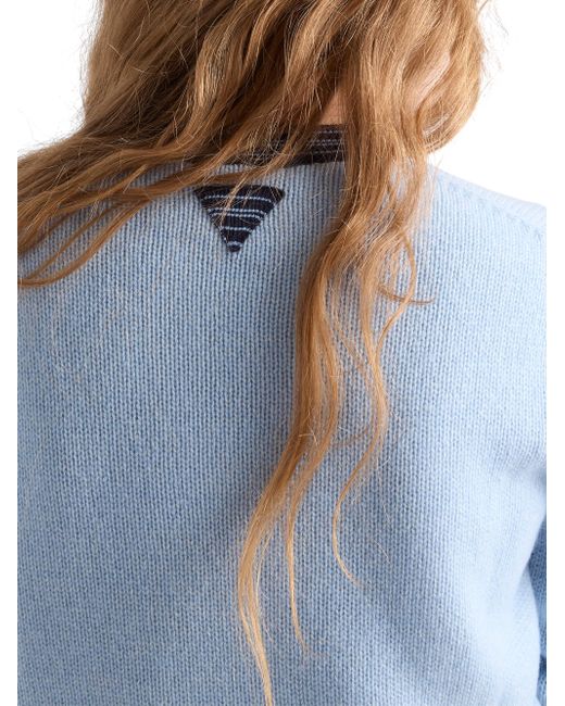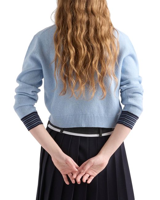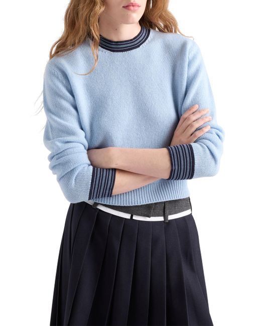 Long sleeves Plain knit Boxy fit Ribbed knit crew neck Drop shoulder Ribbed knit cuffs and hem Knit triangle logo The garment has striped cotton cuffs and a crew neck 16% Cotton, 2% Nylon, 82% Cashmere Imported. Lsd Rtw - Prada Rtw > Prada > Saks Fifth Avenue. Prada. Color: Blue. Size: 2.