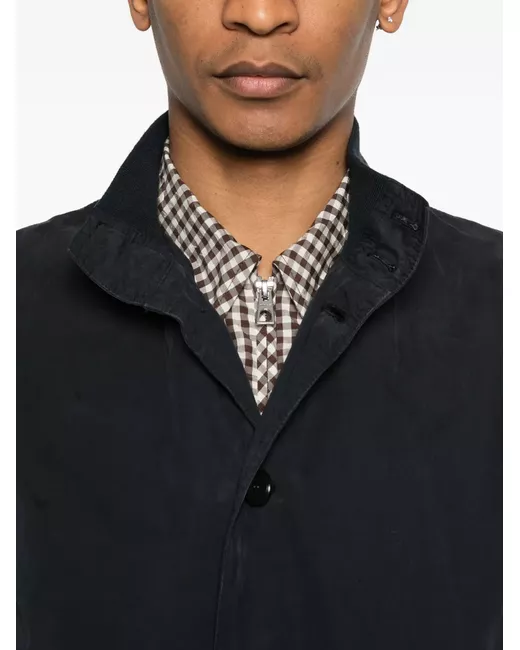 blue button fastening point collar front flap pockets long sleeves ribbed hem