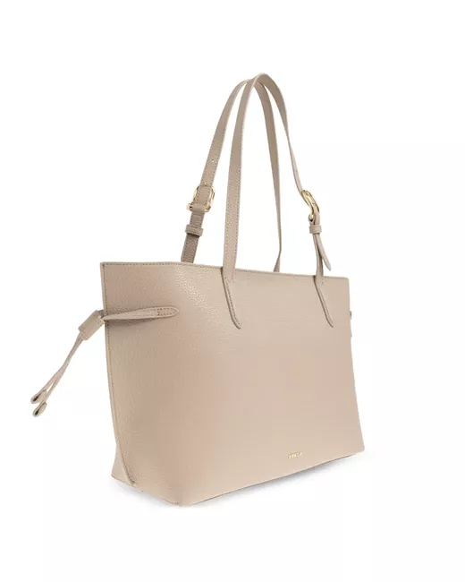 sand beige grained texture adjustable top handles gold-tone hardware side drawstring fastening internal zip-fastening pocket