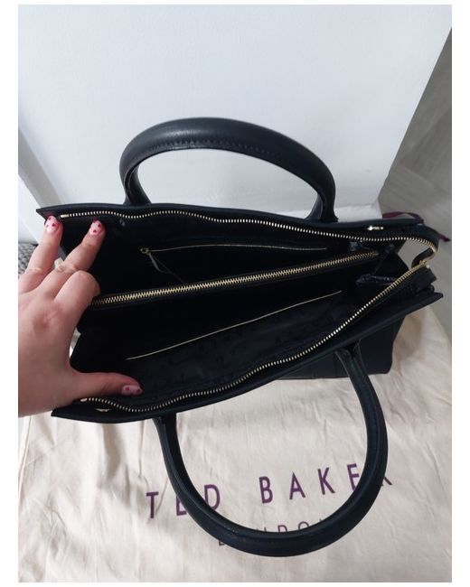 The Ted Baker Bag is a stylish and spacious rectangular tote in classic black leather. It features a secure zip closure, gold hardware, and detachable strap for versatility in styling. Perfect for casual occasions, this designer bag includes inner pockets for organization and is a must-have accessory for fashion-forward women. The Ted Baker brand ensures quality craftsmanship and timeless elegance, making it a standout piece in any wardrobe.