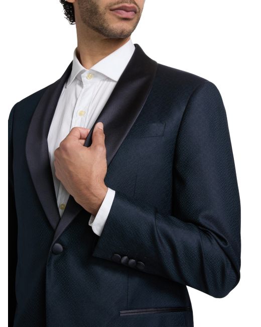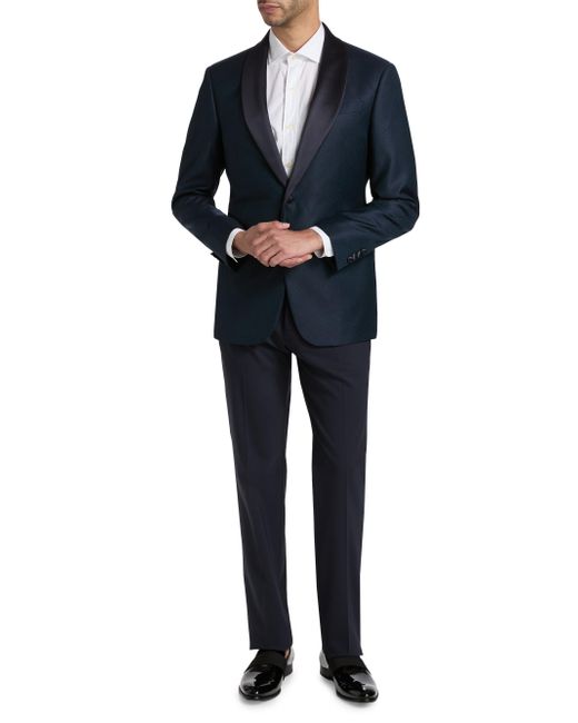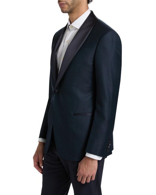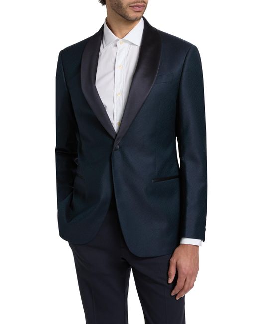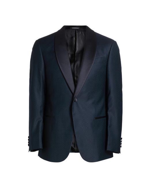 Made in Italy, Emporio Armani's dinner single-breasted jacket is crafted of virgin wool jacquard featuring a satin-trimmed shawl lapel. Shawl lapel Long sleeves Single-button closure 99% virgin wool/1% elastane Combo: 57% polyester/43% silk Lining: 100% viscose Dry clean Made in Italy SIZE & FIT Model measurements: 6'2" tall, 40" chest Model is wearing a US size 40R. Men Luxury Coll - Emporio Armani C > Emporio Armani > Saks Fifth Avenue. Emporio Armani. Color: Teal. Size: 44.