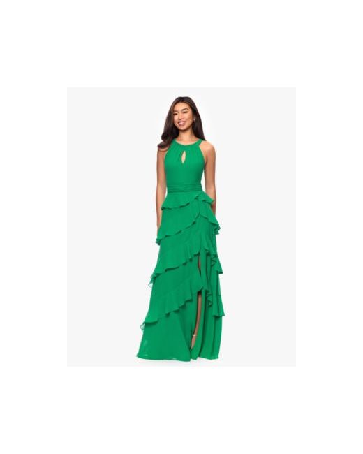 Turn heads at weddings or summer soirees in this Xscape halter dress adorned with tiered ruffles for dynamic movement. A convenient zipper closure provides smooth, comfortable wear from day to evening.
