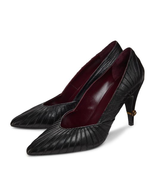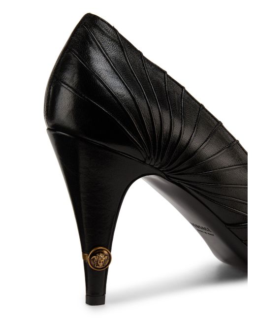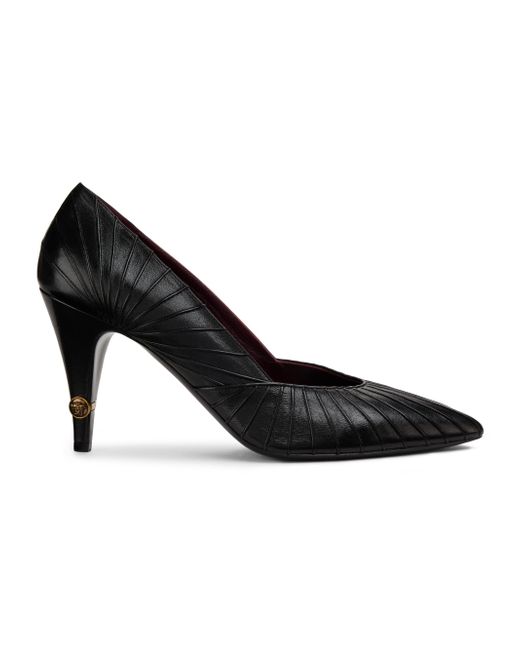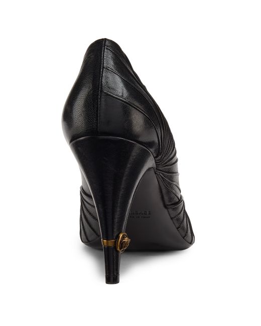Crafted of leather, these Versace pumps feature a seamed upper and a point toe. Point toe Slips on Leather upper Suede lining Leather sole Made in Italy SIZE Heel: about 3.5" (90mm) ABOUT THE BRAND Founded in 1978, Versace is instantly recognizable by the signature Medusa head logo, chosen by founder Gianni Versace for its Greek symbolism. The Italian label is known for its luxe, bold clothing and accessories-think gilding, oversized logos and punchy prints. Since taking over artistic direction, Gianni's sister Donatella Versace has maintained the brand's strong identity, with a renewed vision to give customers the ultimate freedom to express themselves. Women's Shoes - Italian Designer W Shoes > Versace > Saks Fifth Avenue. Versace. Color: Black Gold. Size: 7.