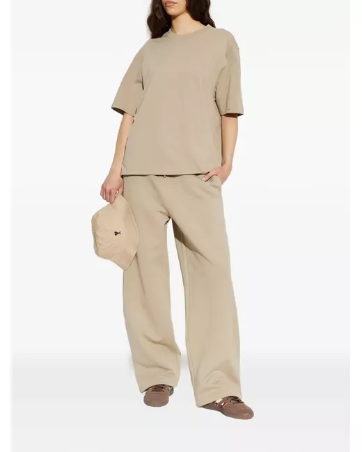 beige embroidered detail drawstring waist ribbed waistband back patch pocket wide leg
