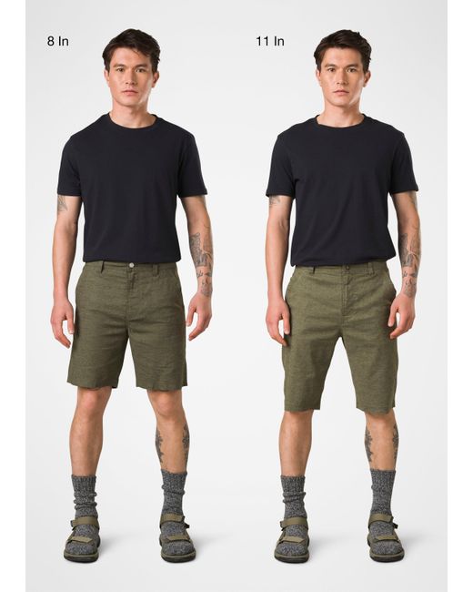 Breathable and lightweight shorts made from a sustainable hemp blend that offers performance-ready stretch. Our action-ready Furrow shorts are made from a hemp blend that's lightweight for easy packing. The stretchy material is naturally odor-reducing and it's got UPF 50+ protection for extra coverage in the sun. A front coin pocket and utility pocket on the thigh keep the essentials handy. | Mens prAna Furrow Short in Green, Size 35