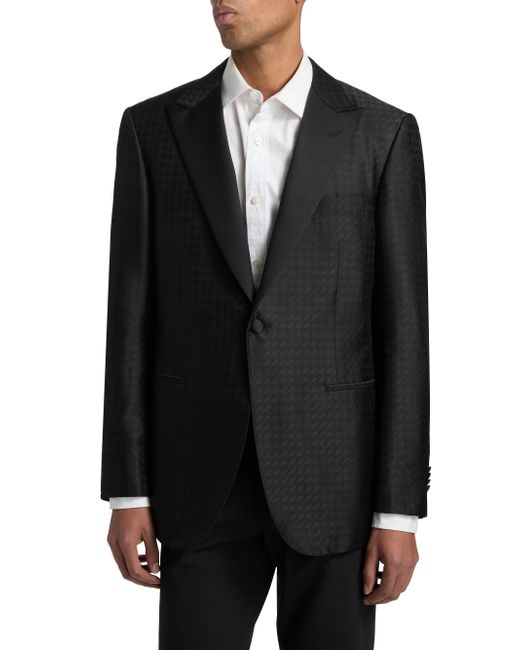 This Canali dinner jacket is crafted of a silk blend with a Frecchia pattern. Peak lapels, side besom pockets, and a single-breasted button-front closure lend elevated structure to this piece. Peak lapels Long sleeves Chest welt pocket Side besom pockets Button-front closure 61% polyester/ 39% silk Dry clean Made in Italy SIZE & FIT Model measurements: 6'2" tall, 40" chest, 31" waist Model is wearing a US size 40R. Men Luxury Coll - Mens Canali > Canali > Saks Fifth Avenue. Canali. Color: Black. Size: 46.