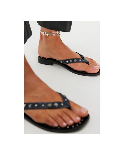 Chase the sun or lounge away in these effortlessly cool flip flops from FP Collection, featuring smooth leather thong straps with studded embellishments and a squared open toe for an easy style with endless character. * Leather thong straps with metal embellishments * Slip-on flip flops * Leather outsole * Short block heel Tide Flip Flops by Free People in Black Leather, Size: US 7