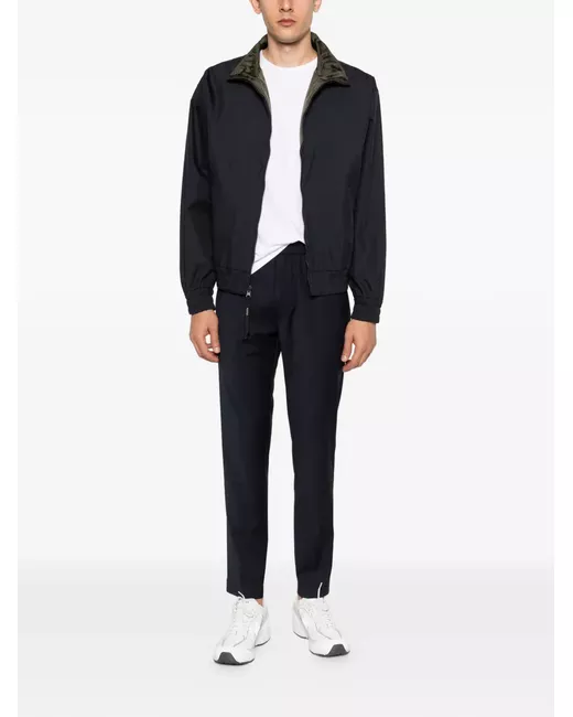 navy blue front zip fastening turn-down collar elasticated cuffs elasticated hem welt pockets