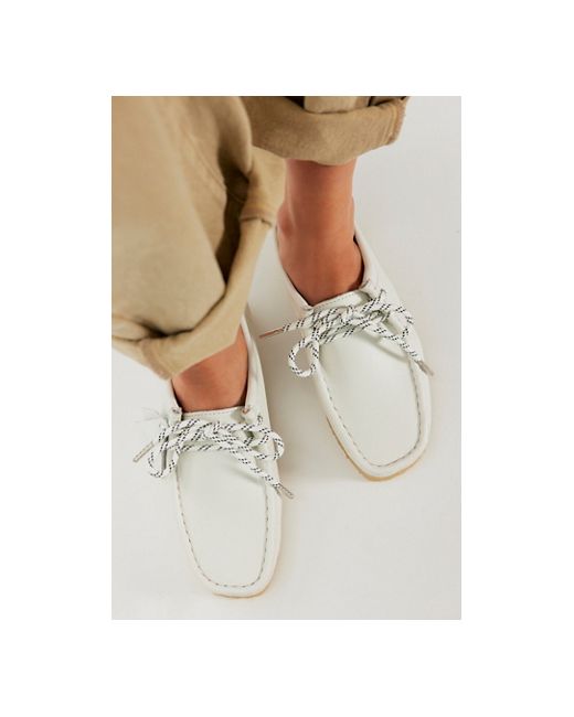 A unique take on a timeless style, these moccasins feature a low ankle length and mini wedge soles for added height. **Features:** Lace-up style, logo tags, leather uppers, mocc stitched round toe, tonal stitching, mini wedge crepe rubber soles **Why We ❤ It:** Stack your favorite anklets for a fun touch. Clarks Leather Wallabees at Free People in White Gran Leather, Size: US 8