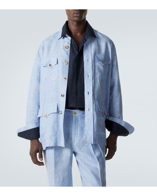 Material: 100% linen. Care instructions: dry clean. Made in Italy. Designer color name: Light Blue. Collar: classic (Straight point). Closure: buttoned placket. Cuff: one button. Pockets: buttoned pockets. Linen.
