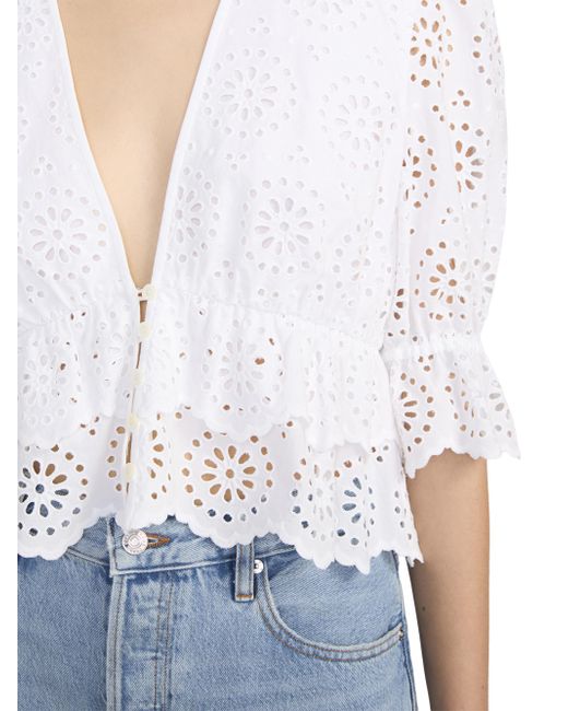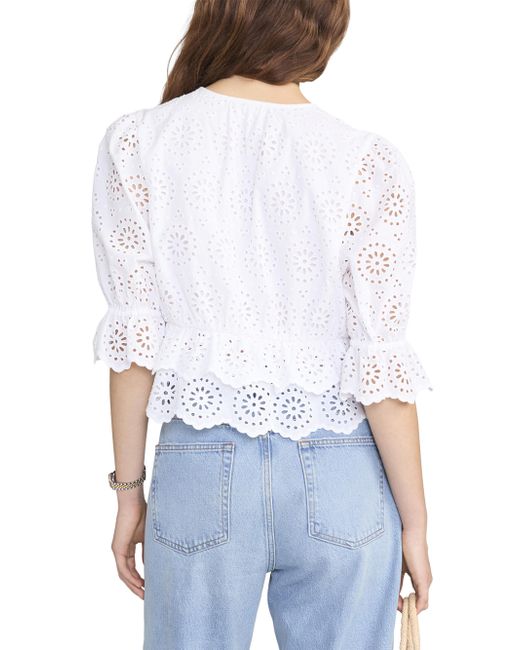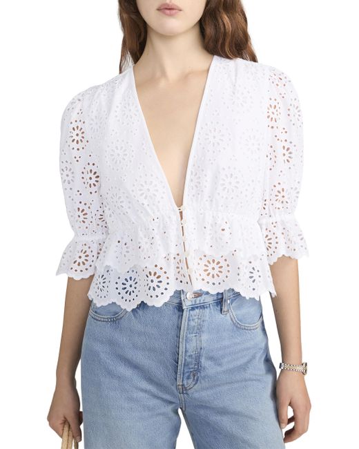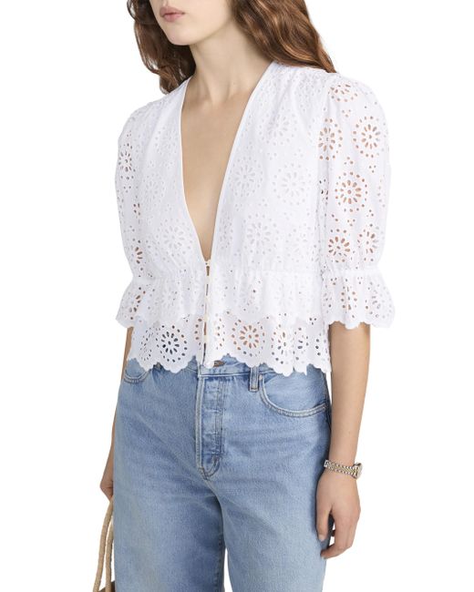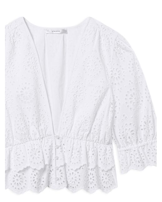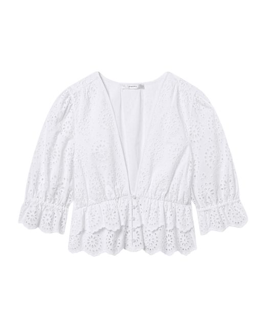 The Solstice blouse from Frame is crafted of cotton, showcasing an eyelet design, a plunging V-neckline, and elbow-length puff sleeves. V-neck Elbow-length puff sleeves Button-front closure 100% cotton Machine wash Imported SIZE & FIT About 20.25" from shoulder to hem Model measurements: 5'10" tall Model is wearing a US size Small ABOUT THE BRAND In 2012, Erik Torstensson and Jens Grede combined their California-modern point of view with a European sensibility to establish Frame. The ready-to-wear label, first known for its denim, has expanded to leather, cashmere and tailoring-all with an effortless ethos at the core. Focusing on quality fabrics and foundational dressing, the brand delivers chic everyday staples favored by Hollywood starlets and beyond. Contemporary Sportswear - Denim And Bottoms > Frame > Saks Fifth Avenue. FRAME. Color: White. Size: XS.