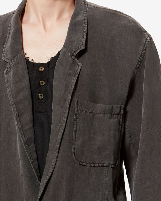 Faded black linen and silk jacket Oversized and flowing Lapel Done up in front with horn buttons Long sleeves Buttoned front gusset pockets and chest pocket Rear vent Style: VE0700HAD2E05H02FK Color: black; Size: 44, 46, 48, 50, 52