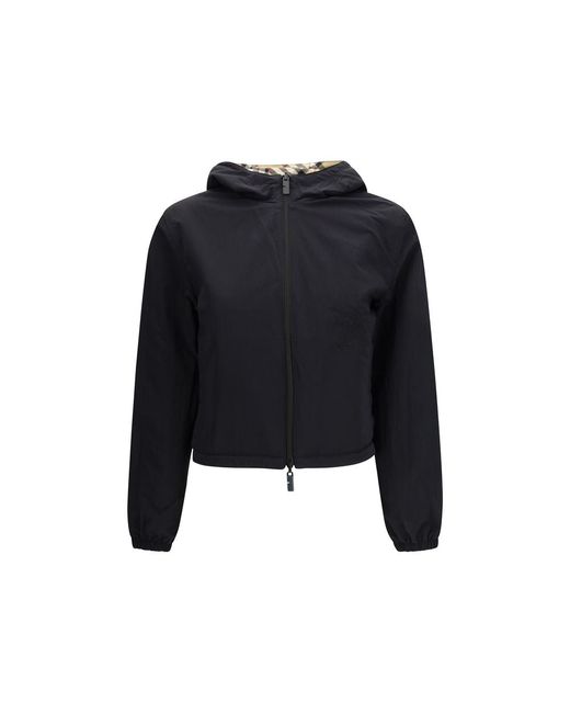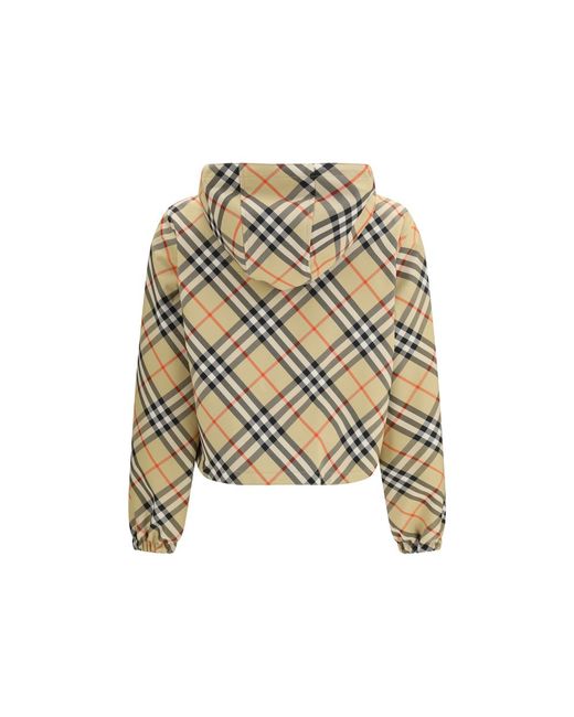 The reversible cropped check Jacket by Burberry combines functionality with iconic style. It features a two-way zip closure, drawstring hood and hem, and elasticated cuffs for a comfortable fit. The reversible design includes side zip pockets on one side and welt pockets with snap buttons on the other. The piece is finished with the Equestrian Knight Design patch on the front, a signature detail of the house. Season: SS26 Fit: Regular Composition: 100% Polyester