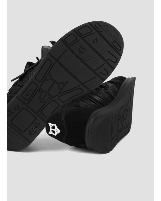 Product Description Engineered for impact. The Expensed sneaker features a precision-cut satin scrunch and suede upper paired with a leather logo and detachable Wolfe head patch for modular styling. Double ribbon laces offer a structured fit, while a breathable mesh lining and custom-moulded sock design enhance comfort and airflow. Finished in an all black colour way, it sits on a high-performance PU and rubber outsole with integrated Naked Wolfe branding for traction and durability. Features 40mm outsole height Satin scrunch, leather and suede upper Leather logo Soft insole with logo detail Rubber outsole Rubber heel logo Branded metal lace lock Double Satin and Chiffon Ribbon lace Extra cotton skater lace in box. Hanging detachable cow suede logo