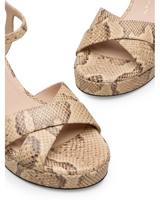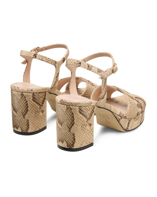 Crafted of leather, Stuart Weitzman's Dayna platform sandals showcase a snake-print, chunky block heel, a crisscross vamp, and an open toe. Open toe Buckle closure Leather upper Leather lining TPU/leather sole Made in Spain SIZE Block heel: about 3.20" (80mm) Platform: about 0.75" (20mm) ABOUT THE BRAND Designer Stuart Weitzman started his career designing for his father's shoe company before launching his own brand in 1986. Known for his glamorous pumps and over-the-knee boots, Weitzman has also incorporated unique materials in his designs, ranging from Lucite and wallpaper to cork, vinyl, and even gold. Today, the label continues to create classic, feminine silhouettes that balance both comfort and style. Women's Shoes - Stuart Weitzman W Shoes > Stuart Weitzman > Saks Fifth Avenue. Stuart Weitzman. Color: Adobe. Size: 10.