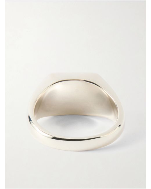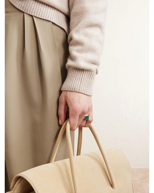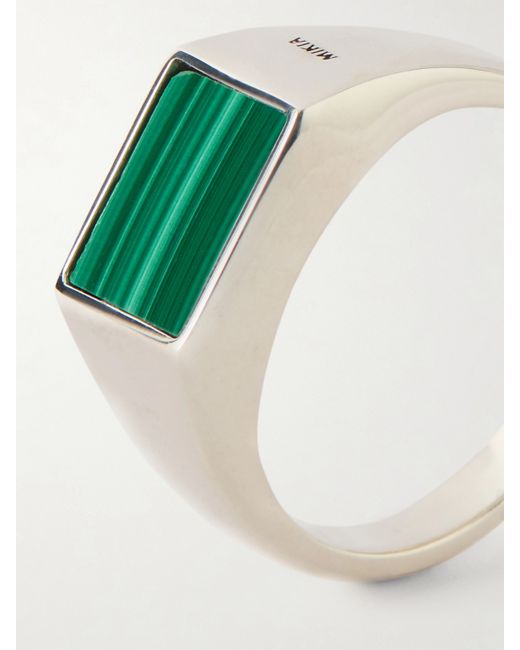 Mikia’s ring features a rectangular malachite stone set in sterling silver. The vivid green of the stone and the minimal setting create a graphic, focused effect, reflecting the brand’s pared-back, contemporary aesthetic.