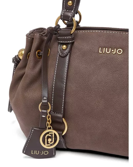 brown centre compartment logo charm drawstring detail matching shoulder strap zip closure