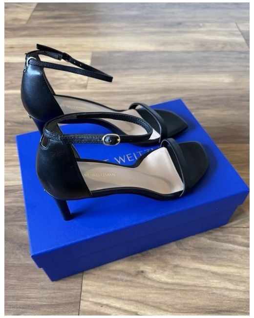 Minimalistic Calf Skin Leather Mid Heel: 75mm Open Square Toe Buckle Fastening Ankle Strap Rubber Sole Stuart Weitzman Icon