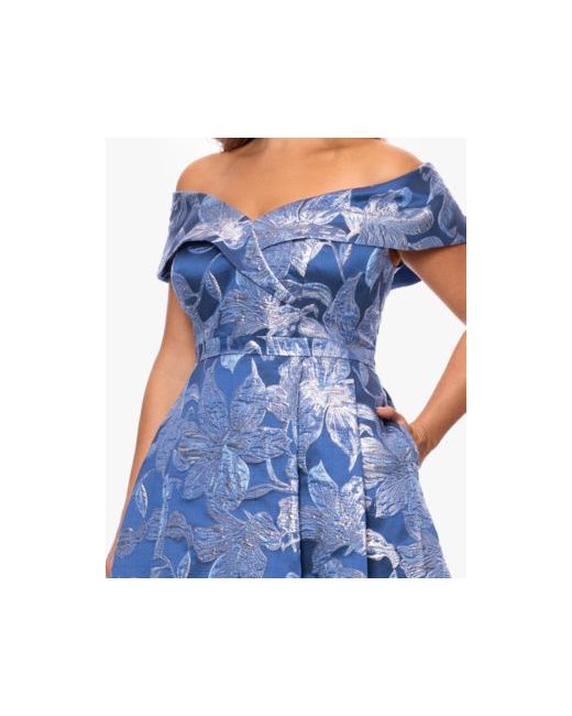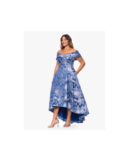 Graceful formal styling leads this Xscape hi-low gown, showcasing a sweetheart off-the-shoulder neckline that elegantly frames the upper silhouette. Hip pockets introduce a convenient function, while a center-back zipper secures the fit.