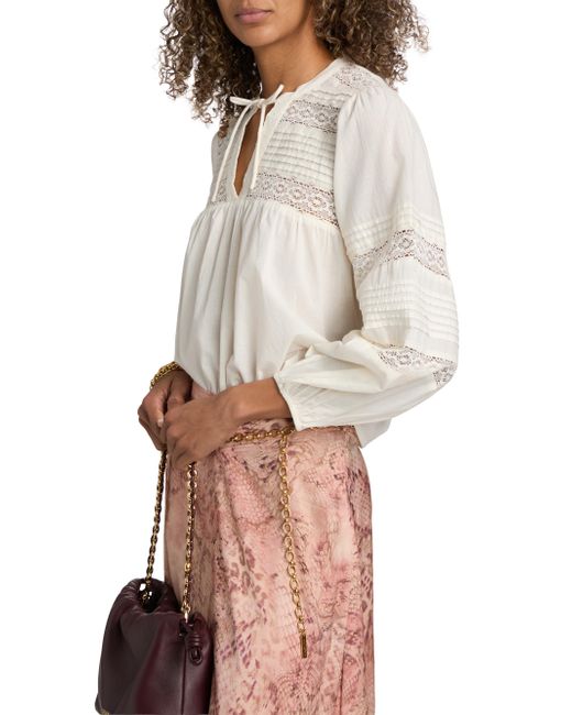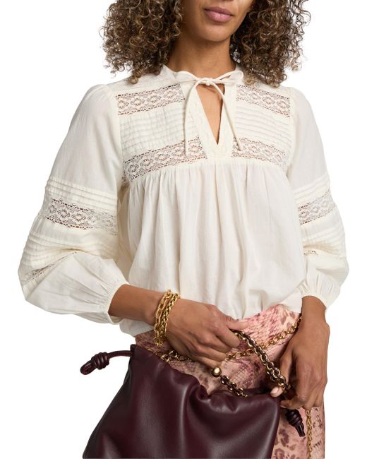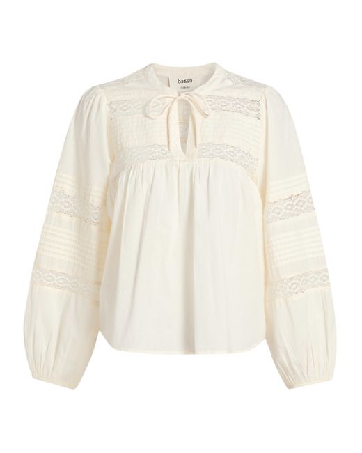The Nami blouse from ba & sh blouse is styled with a delicate tieneck and a small keyhole cut out. It is adorned with intricate lace inserts and pleated panels across the chest and voluminous balloon sleeves for a romantic, bohemian aesthetic. Tieneck Long balloon sleeves Pulls over 100% cotton Dry clean Imported SIZE & FIT Model measurements: 5'10" tall Model is wearing a US size 4. Contemporary Sportswear - Contemporary Lifestyle > Ba & sh > Saks Fifth Avenue. ba & sh. Color: Ecru. Size: XS.