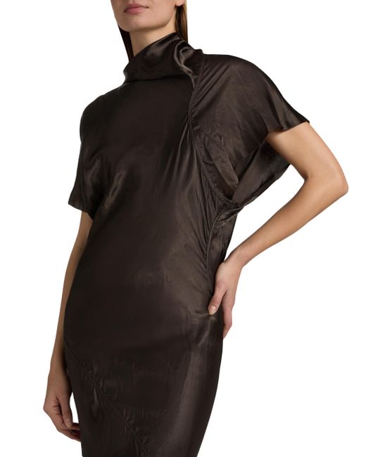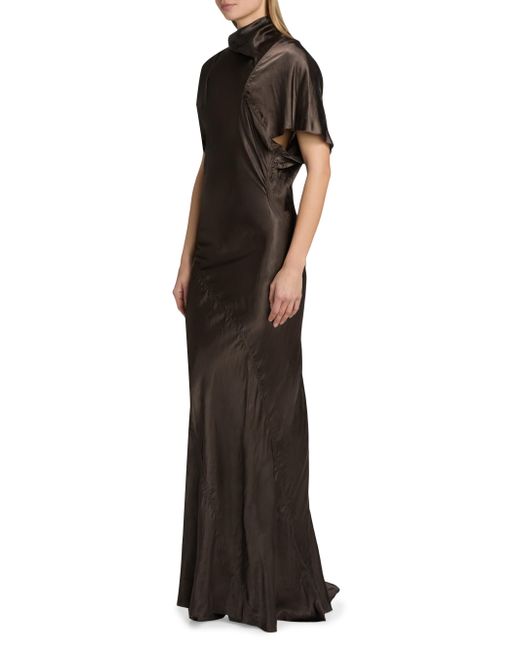 Rick Owens' Temple Seb gown is a masterwork of bias-cut architecture, rendered in a glossy, washed satin. The floor-length body features short, wide kimono-inspired sleeves and a high, cascading cowl neck that drapes into a sharp, asymmetric opening at the back. Cowlneck Elbow-length sleeves Pulls over 100% cupro Hand wash Made in Italy SIZE & FIT This style is bias cut to glide smoothly over curves About 70" from shoulder to hem Bust: about 44" Waist: about 34" Hips: about 34" Model measurements: 5'10" tall Model is wearing a US size 4 Please note: Compared to the Saks Size Guide, this style measures true to size. Advanced Designer - Designer Collections > Rick Owens > Saks Fifth Avenue. Rick Owens. Color: Dark Dust. Size: 8.