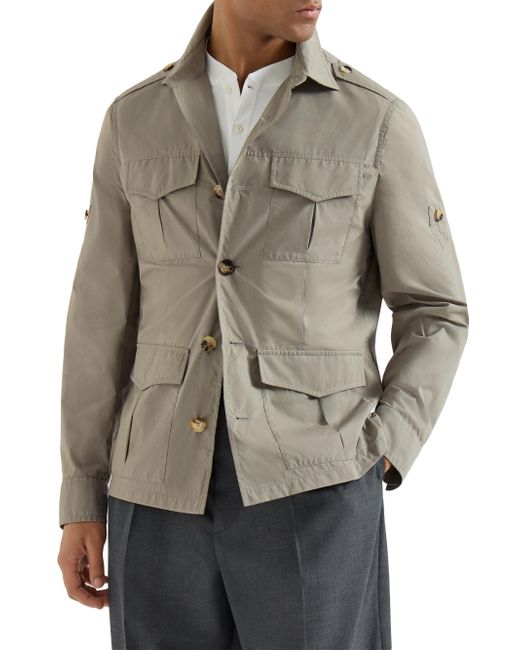 Lightweight water-resistant techno cotton unlined safari jacket. Horn button closure Shirt-style collar High patch pockets with flap and button Low patch pockets with flap and button Cuffs with three horn buttons Button to secure the sleeve Two internal pockets with button and a pen holder Unlined For cleaning, contact a professional service and request delicate dry cleaning. Do not bleach. Do not tumble dry. Hang dry, iron at low temperature 64% cotton, 36% nylon Made in Italy. Lsd Rtw - Brunello Cucinelli Rtw > Brunello Cucinelli > Saks Fifth Avenue. Brunello Cucinelli. Color: Khaki. Size: 32.
