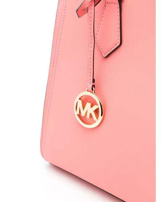 salmon pink leather two rounded top handles gold-tone hardware logo plaque single shoulder strap internal slip pocket internal logo patch