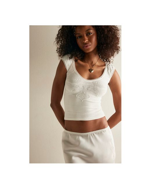 Soft and sweet in our favorite seamless fabrication, this darling top from Intimately features a scoop neckline with delicate, loopy picot trim, fitted cap sleeves, and floral details at the bust that turn into a classic rib for a textured, timeless piece. * Textured seamless fabrication * Pull-on, form-fitting crop top * Wide scoop neckline * Short capped sleeves Pretty Please Crop Top by Intimately at Free People in Clean Ivory, Size: XS/S