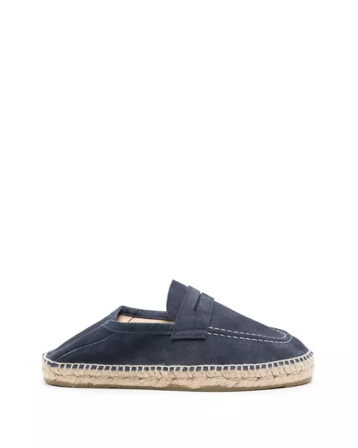 blue calf leather suede contrast stitching penny slot logo at the sole round toe branded footbed braided raffia sole rubber outsole slip-on style This piece comes complete with a protective dust bag.