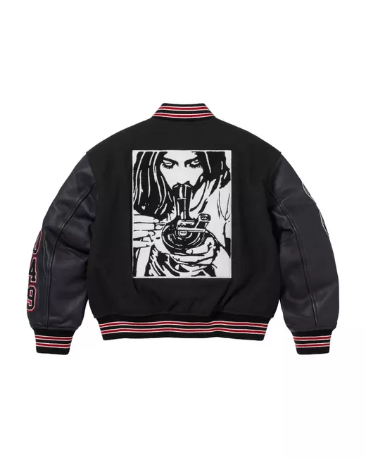 black front press-stud fastening stripe detailing ribbed band collar contrasting-fabric sleeves long sleeves logo patch at the sleeve number patch to the sleeve logo patch at the chest two diagonal pockets to the sides graphic print to the rear ribbed cuffs and hem full lining