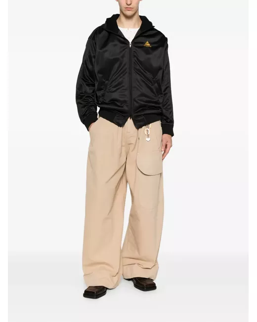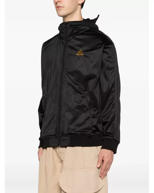 black satin finish logo print classic hood front zip fastening long sleeves two side slit pockets ribbed cuffs and hem
