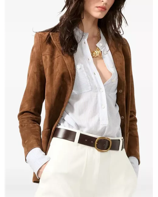 brown suede front button closure notched lapels front patch pocket seam detailing