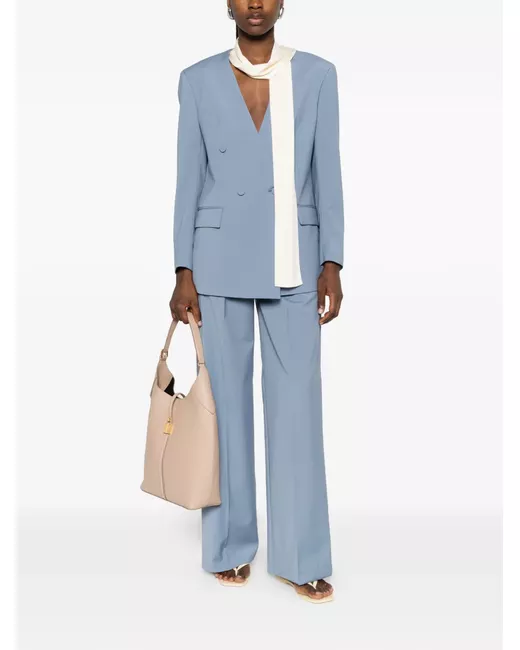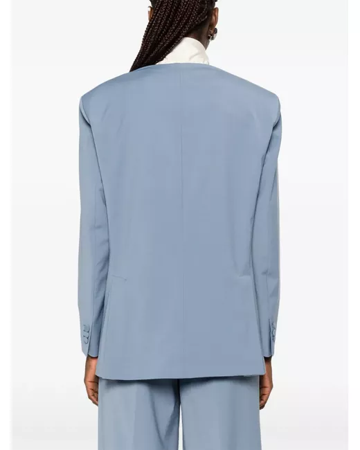 blue double-breasted button fastening collarless long sleeves two front flap pockets belt loops two rear welt pockets