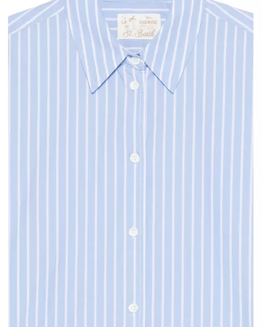light blue vertical stripe print buttoned front closure classic collar long sleeves embroidery