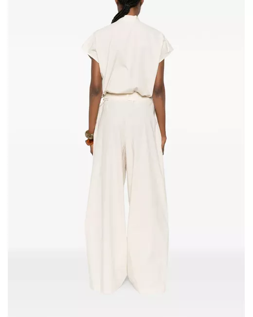 beige front button fastening band collar short sleeves chest patch pocket belt loops tied waist two side pockets wide leg