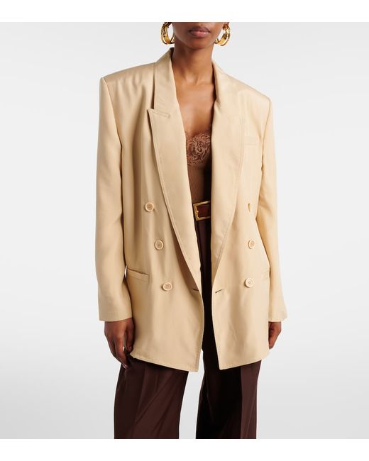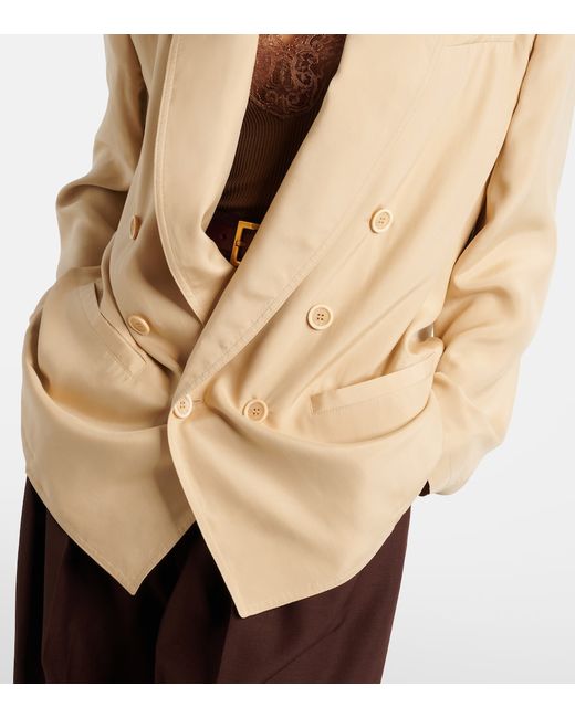 Material: 100% silk. Care instructions: dry clean. Made in Italy. Designer color name: Creme. Silk. Peak lapel. Closure: double-breasted (six buttons). Pockets: angled chest pocket, slit pockets. Contains non-textile parts of animal origin. Lining: 100% silk.
