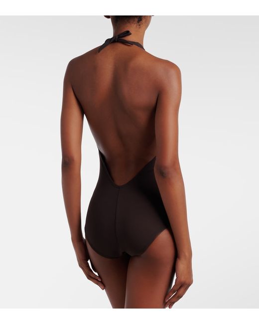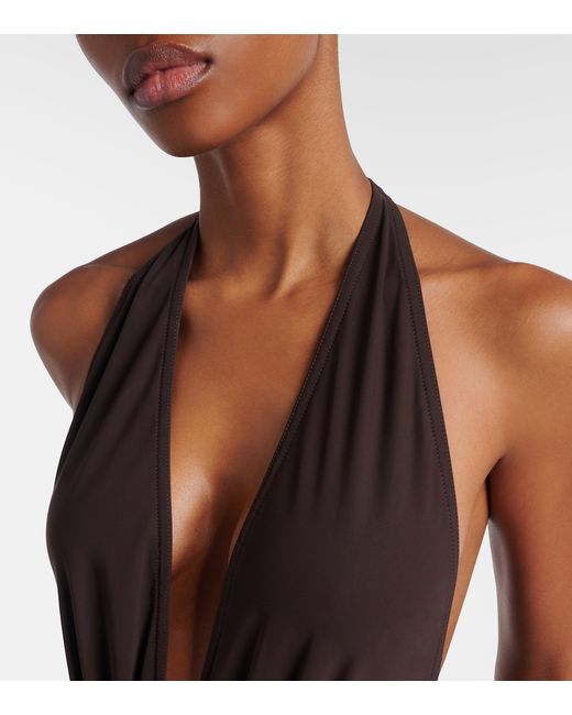 Material: 75% nylon, 25% elastane. Care instructions: hand wash. Made in the USA. Designer color name: Chocolate. Self-tie neck.