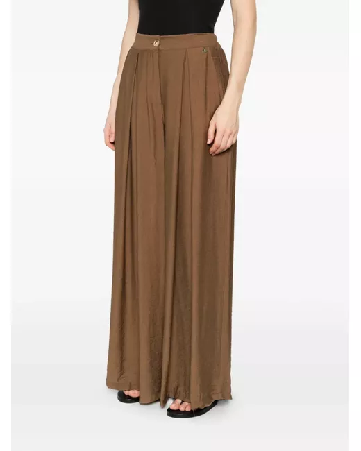 brown textured fabric pleated front elasticated waistband button and zip fastening side pockets wide leg