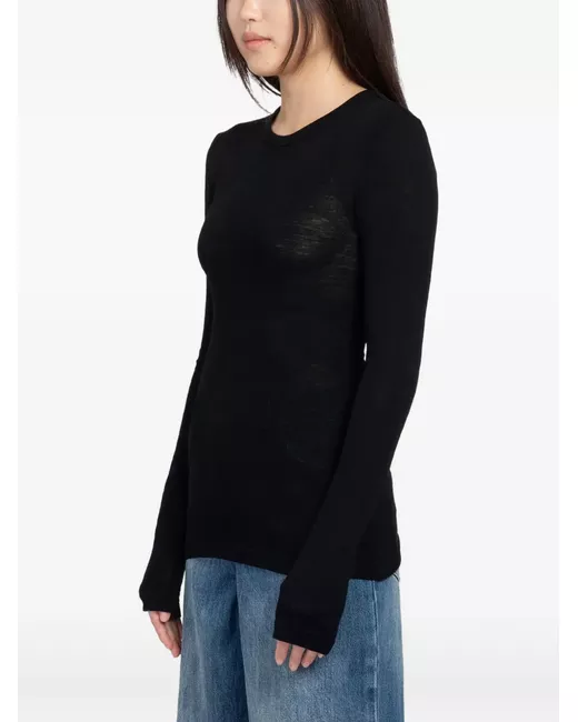 black semi-sheer construction slub texture crew neck long sleeves straight hem slim fit