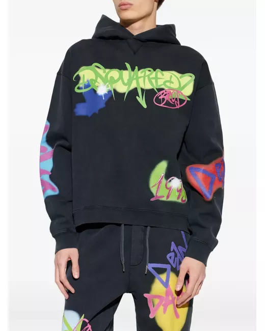 black graffiti print fixed hood long sleeves ribbed cuffs and hem V-insert at the neck