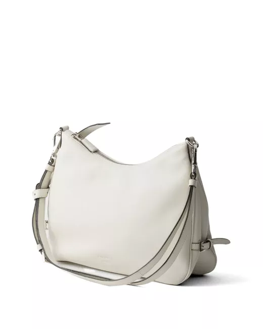 This bag with contemporary and minimalist elegance is defined by sleek, sophisticated details and archive touches. The leather bag has two soft compartments, while the zipper closure underlines its pragmatic and versatile character. The design is completed by an adjustable leather shoulder strap for convenient, everyday wear as a shoulder or crossbody bag. adjustable leather shoulder strap. Maximum length 67 cm - Minimum length: 60 cm - Maximum drop 45 cm - Minimum drop 40 cm Metal hardware Embossed lettering logo on the front Zipper closure Logo-print nylon lining with two pockets, including one with zipper