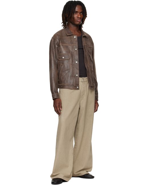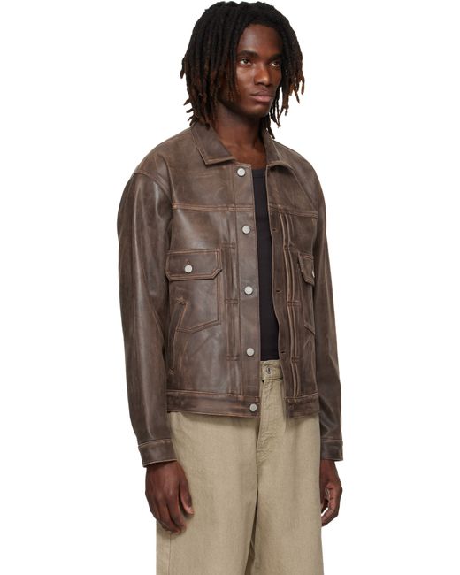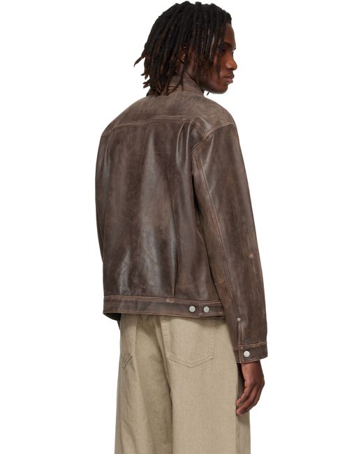 Grained sheepskin jacket. · Fading and scuff marks throughout · Spread collar · Button closure with pleated placket · Overlapping chest and waist pockets · Buttoned barrel cuffs · Buttoned tabs at back hem · Full satin lining Supplier color: Brown