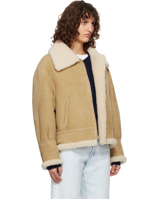 Lambskin suede jacket. · Shearling trim at spread collar, hem, and cuffs · Pin-buckle straps at collar and back hem · Zip closure · Welt pockets at front · Lambskin shearling interior Supplier color: Biscuit