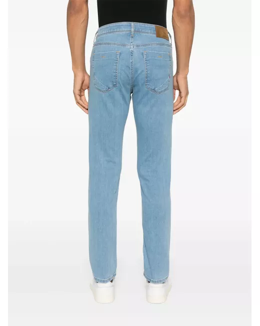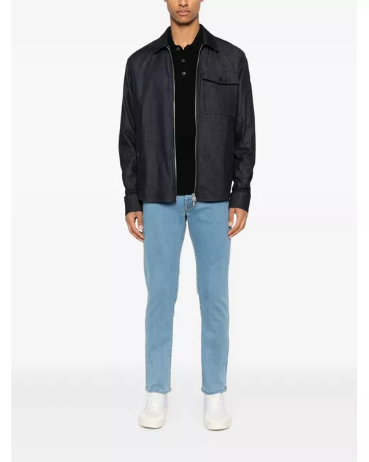 blue cotton-blend stonewashed whiskering effect front button and zip fastening belt loops classic five pockets slim cut